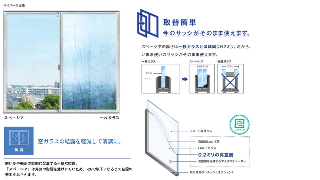 別名「真空ガラス」。外気が低くても、室内側ガラスの表面温度が下がりにくい構造なっており、結露の発生を大幅に抑えることが出来ます◎