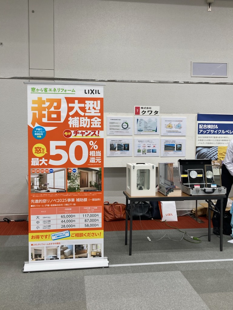 今回私たちのブースの展示では、脱炭素につながる商品として窓リフォーム商材である内窓(二重窓)やサッシ毎交換のカバー工法、真空硝子などを展示。