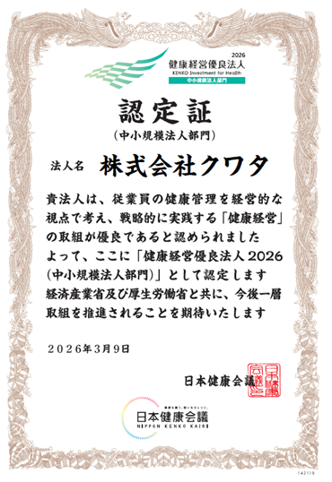 この度、株式会社クワタは「健康経営優良法人2026(中小規模法人部門)」に認定されました。